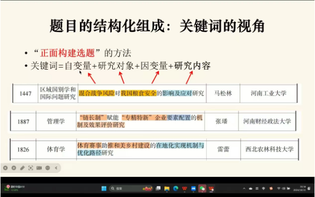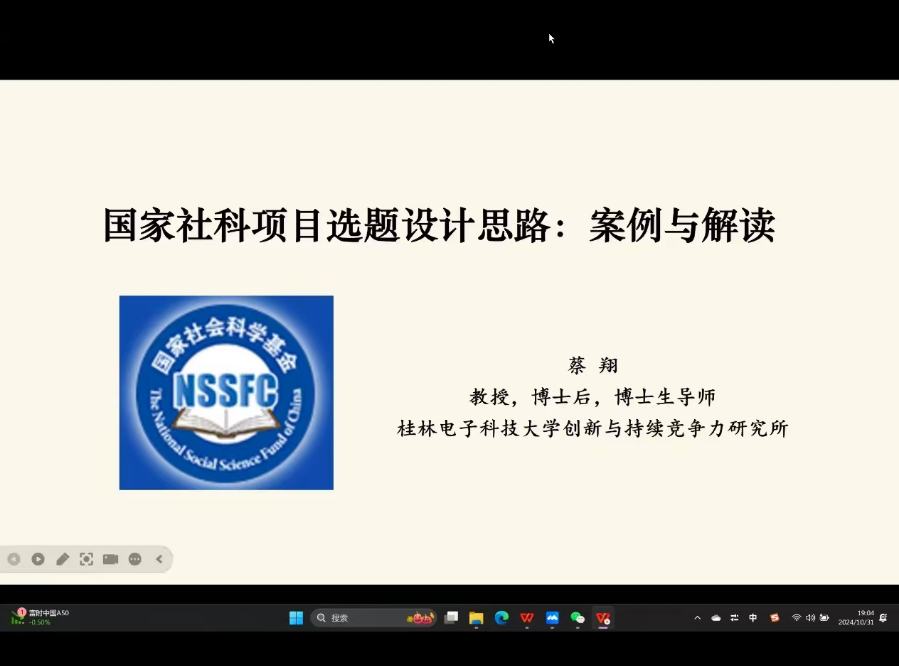(通讯员 谢薇)为了帮助公司师生更好地理解国家社科项目的申报要求,提升选题质量,推动科研创新与学科发展。10月31日19:00,公司通过腾讯会议举行了长江经管讲坛第六十五讲,桂林电子科技大学软科学研究院副经理蔡翔受邀宣讲,针对国家社科项目的选题设计思路进行了全面而深入的解读。太阳成tyc33455ccwww副经理裴潇、教师代表、2023级和2024级研究生到场参会。本次会议由副教授周欣星主持。