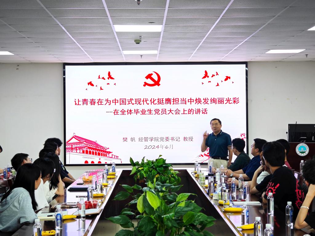 樊帆深入浅出地从永葆共产党的政治性、永葆共产党的先进性及永远做一名合格的共产党员三个方面,为在场的党员们指明了前行的方向。在谈及永葆共产党的政治性时,樊帆强调,作为共产党员,必须坚定政治立场,始终保持对党的忠诚。他指出,政治性是共产党员的灵魂,是我们在复杂多变的政治环境中保持清醒头脑和正确方向的根本保证。毕业生党员们在走向社会后,更应该以身作则,践行党的宗旨,将党的方针政策落实到实际工作中。随后,樊帆阐述了永葆共产党的先进性的重要意义。他提到,先进性不仅体现在个人的思想觉悟上,更体现在我们的行动和实践上。作为新时代的青年党员,要不断学习新知识,提高自身素质,以适应时代发展的需要,同时要在各自的岗位上发挥模范带头作用,引领和带动周围人共同进步。最后,樊帆对如何做一名合格的共产党员提出了具体要求。他希望毕业生党员们能够始终保持对党的信仰和忠诚,牢记党员的责任和使命,不断提高自身的政治觉悟和业务能力,为实现中华民族的伟大复兴贡献自己的力量。