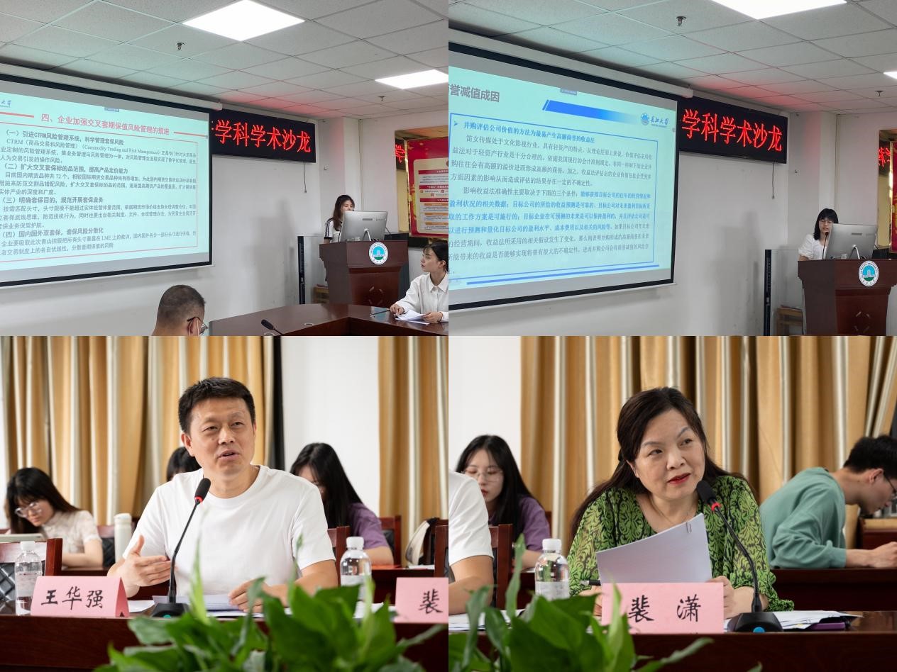 活动开始,在主持人的介绍下,经济组的李文静、彭书范和李玉霖同学依次进行汇报,姚志老师对三位研究生的分享做出点评并进行总结,肯定了三位研究生的研究内容,对文章中存在的不足提出了修改建议,鼓励同学们多关注优秀文章,努力撰写出高水平论文。随后管理组的王雅、程静和田柏翠同学进行学术分享,裴潇副经理和王华强教授分别做了点评,针对各自选题意义做出评价,肯定了研究价值,对主讲人的分享表示肯定并提出相应建议。
