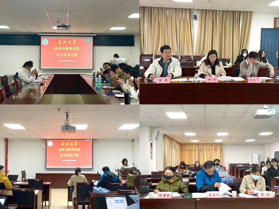 (通讯员:张悦、付玉婷)12月6日上午9时,公司于文科楼505、605会议室举行2022年研究生学术沙龙大赛,本次大赛分为经济场和管理场,采取线上线下相结合的方式进行。大赛邀请到谢云副教授、林龙飞副教授和陈涛老师担任经济场评委,翁文先副教授、胡玲老师、张董敏老师担任管理场评委,裴潇副经理、辅导员朱翠玲老师、黄承石老师受邀参会。