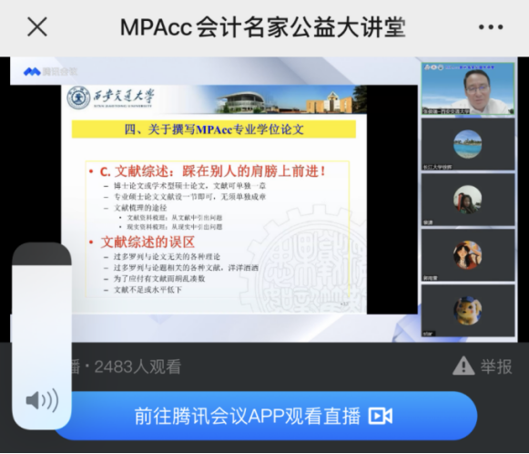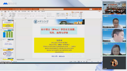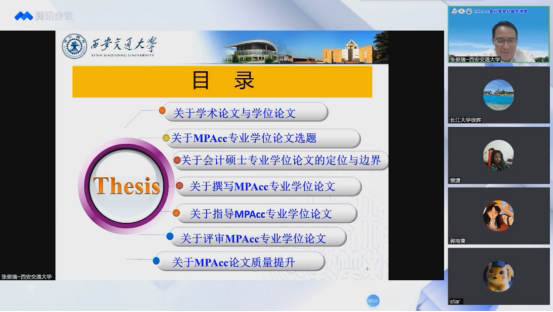 张教授则首先感谢了中国会计学会、全国会计专业学位研究生教育指导委员会和太阳成tyc33455ccwww提供的这次交流机会,并祝贺公司会计学成为国家级一流本科专业建设点;随后,他从学术论文与学位论文的区别谈起,给出了MPAcc学位论文研究类型的选择建议,重点对MPAcc学位论文的选题、定位与边界进行了阐述,指出MPAcc学位论文应紧密结合会计实务;接着,张教授围绕MPAcc学位论文的撰写、指导与评审三个方面分别结合实际案例列举了许多共性问题,并为解决以上问题、提升MPAcc学位论文质量提供了一系列建议;最后,师生们与张教授就MPAcc学位论文写作的相关问题进行了积极的线上交流与互动。
