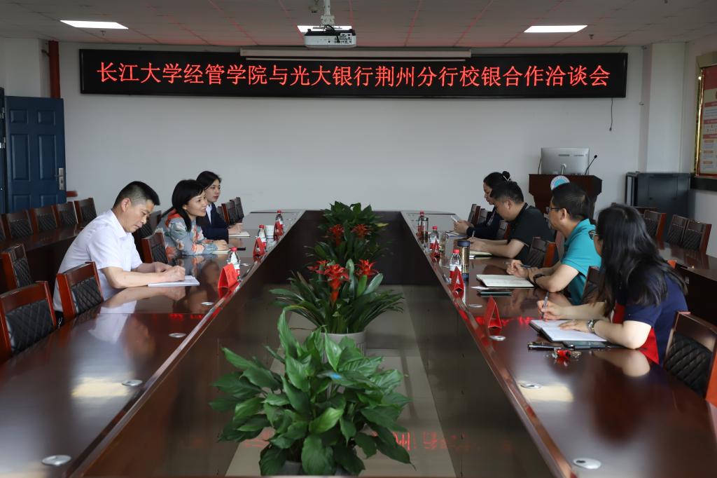 (通讯员 彭蓉)4月25日下午,中国光大银行荆州分行总部一行三人来访,在文科楼505会议室召开了校银合作洽谈会。中国光大银行荆州分行行长徐静、副行长王力军、零售部总经理钟毅,经管公司经理徐辉、副经理陈承、公司党委副书记王中梅、公司办公室主任彭蓉参加了此次座谈。
