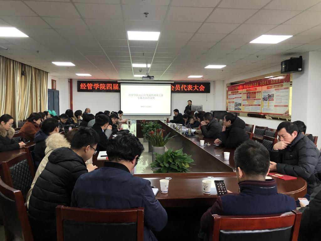 2022年1月20日上午,经管公司在文科楼505会议室召开了教职工暨工会会员代表大会,全院43名教职工代表参加了会议,大会由党委书记樊帆主持。按照会议议程,首先由徐辉经理代表公司班子作工作报告,然后由工会主席王中梅和副经理陈承分别作工会工作报告和财务工作报告,最后由郭睦庚副经理代表财务分配委员会讲解了公司2021年奖励性绩效工资实施办法。