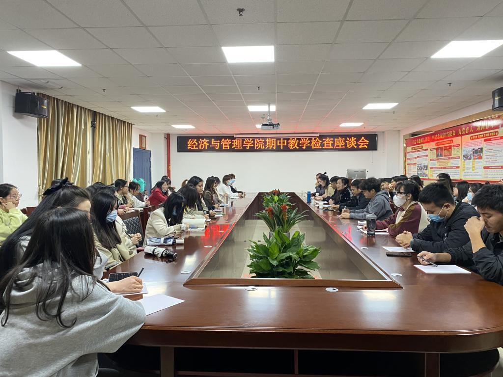 经管公司2021-2022第一学期研究生教学期中检查座谈会于2011.11.4晚19时在文科楼505会议室举行,公司研究生管理团队(分管副经理裴潇、MBA教育中心主任李洪文、MPAcc教育中心主任叶云、研究生秘书谢本贵/余晶晶、研究生辅导员朱翠玲等)及2020级、2021级研究生代表共60余人参加了此次座谈会。分管副经理裴潇主持了会议。
