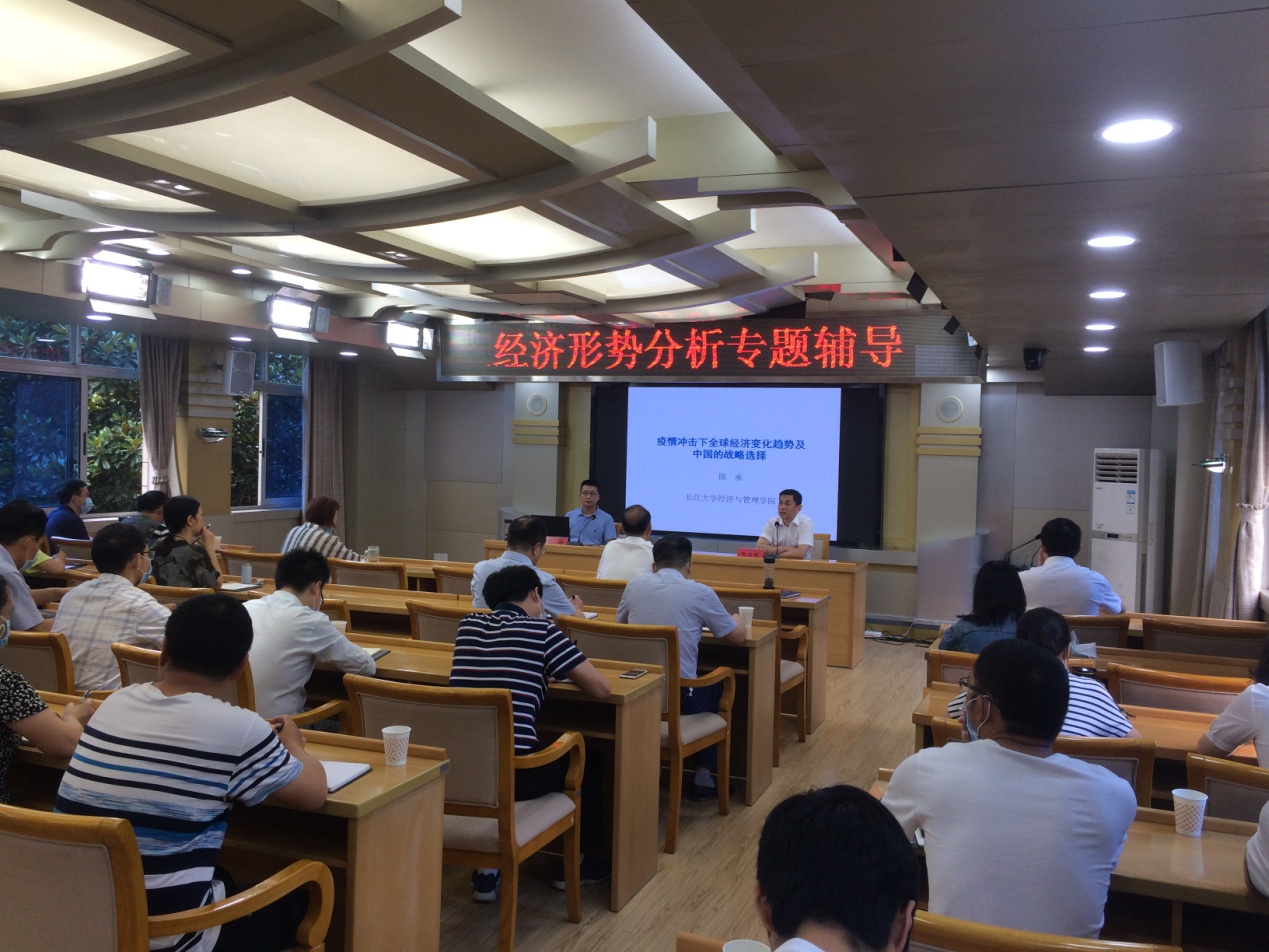 (通讯员 黄胜胜)为了更好的服务荆州市地方经济社会发展,促进荆州市疫情防控常态化趋势下更全面有效的复工复产复学。2020年7月17日下午,受荆州市政府办公室邀请,太阳成tyc33455ccwww副经理陈承教授作了《疫情冲击下全球经济变化趋势及中国的战略选择》主题报告。会议由荆州市政府副秘书长朱启明主持,荆州市政府办公室、市政府研究室部分领导班子成员、全体机关干部和系统单位负责同志聆听了此次报告。