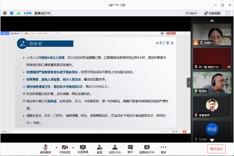 为了做好毕业生安全返校离校工作,6月13日上午10时,经济与管理公司通过网络平台召开2020届毕业生安全返校教育大会。公司经理徐辉、党委副书记王中梅、学工办主任陈思杭、就业专干李博、毕业年级辅导员朱翠玲、叶星以及全体20届本科毕业生和研究生毕业生参与大会。