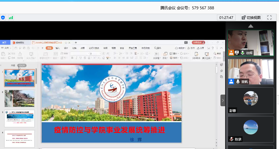 陈承副经理详细通报了本科教学工作,主要包括在线教学、本学期课程考试、教材征订、2020年本科人才培养方案修订、毕业论文答辩、制定本科教学工作管理制度六个方面。他希望老师们根据现今形势,创新教学方法,提升教学质量。
