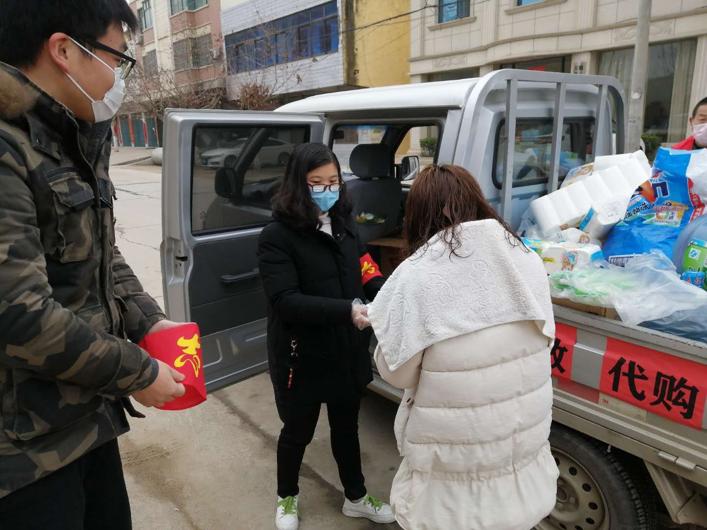 村委会经过一致协商,从2月7日起,每隔三天就帮村民们统一采购一次物资。吴梦怡主动担任四组物资采购的组长,每天早晨8:00就开始在微信群(物资采购)开始统计村民们的物资需求信息,中午 12:00汇总好相应的物资的信息后便随同大卡车去镇上采购物资,往返需要半天的时间,返回村里时已是下午18:00。第二天赶早就将物资清点好,给村民们挨家挨户发放物资。物资的清点和发放工作很繁琐,并且由于疫情期间物资匮乏,村民们的需求得不到很好的满足,但是吴梦怡和其老员工志愿者团队尽可能地去更好地满足大家的需求,去贡献自己的一份微薄之力。