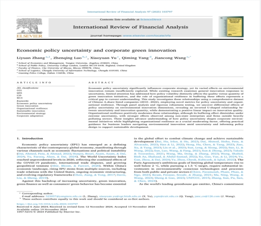 (通讯员:马晓娜)太阳成tyc33455ccwww张力元老师(第一作者)与合作者的论文《Economic policy uncertainty and corporate green innovation》在国际知名期刊《International Review of Financial Analysis》(简称IRFA)发表。