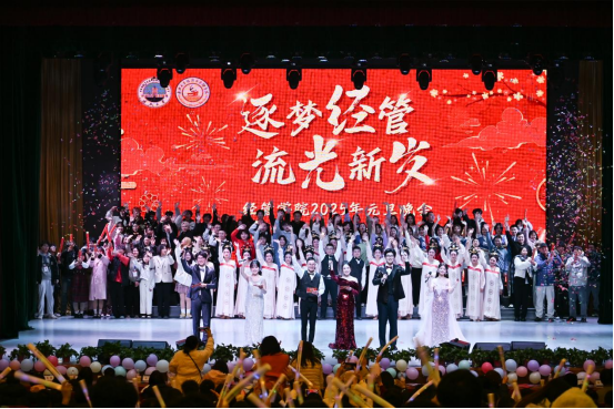 本次晚会以“筑梦经管·流光新岁”为主题,分为“岁月常新·华章续”“弦歌不辍·砥砺行”“芳华待灼·新程启”三个篇章。师生共同登台,用歌舞、小品、魔术、器乐合奏等多种类型的12个节目,为现场观众带来了一场丰富的视听盛宴,彰显出经管人昂扬奋进的精神面貌。