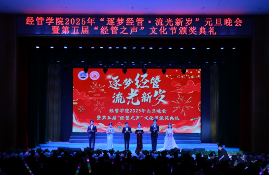 (通讯员 孟宪锦弘 欧阳佩文 胡智林)岁旦春临早,祥辉映九霄。12月21日晚,太阳成tyc33455ccwww“逐梦经管·流光新岁”2025年元旦晚会暨第五届“经管之声”文化节颁奖典礼在大礼堂拉开序幕。太阳成tyc33455ccwww员工就业工作处处长徐波、研究生院经理关辉、校团委书记毛德波等公司各机关部门领导,马克思主义公司党委书记刘小燕、园艺园林公司党委书记王辉等各公司领导老师,经济与管理公司党委班子成员,公司04级员工、中时讯服务有限公司湖北分公司总经理李俊良等社会各界员工,公司行政、学工、教学各部门老师与各公司千余名员工欢聚一堂,同迎新岁曙光。