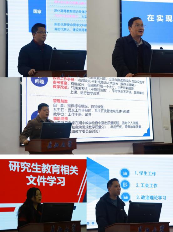 会上,经理陈承首先围绕公司高质量发展现状、进展及展望进行了深入阐述,他细数了公司一年来的工作成就和面临的问题。紧接着,副经理何蒲明分享了科研工作的年终总结及未来计划,为公司的科研事业注入了新的活力。副经理王华强则就本科教育期末进行总结,并对下学期的教学计划进行了部署。同时,副经理裴潇针对研究生教育的学位论文抽检、相关通知及求实导师论坛进行了详细介绍,对研究生导师们提出了更高要求。党委副书记平先锋在会议上,深入阐述了员工工作与工会工作的现状与发展,并组织了理论学习环节。他围绕“习近平总书记于2024年5月27日在二十届中央政治局第十四次集体学习时发表的重要讲话之《促进高质量充分就业》的核心内容”、“2024年9月15日中共中央、国务院发布的《关于实施就业优先战略促进高质量充分就业的意见》的深刻内涵”,以及“习近平总书记考察湖北时发表的重要讲话精神”进行了细致解读与分享。