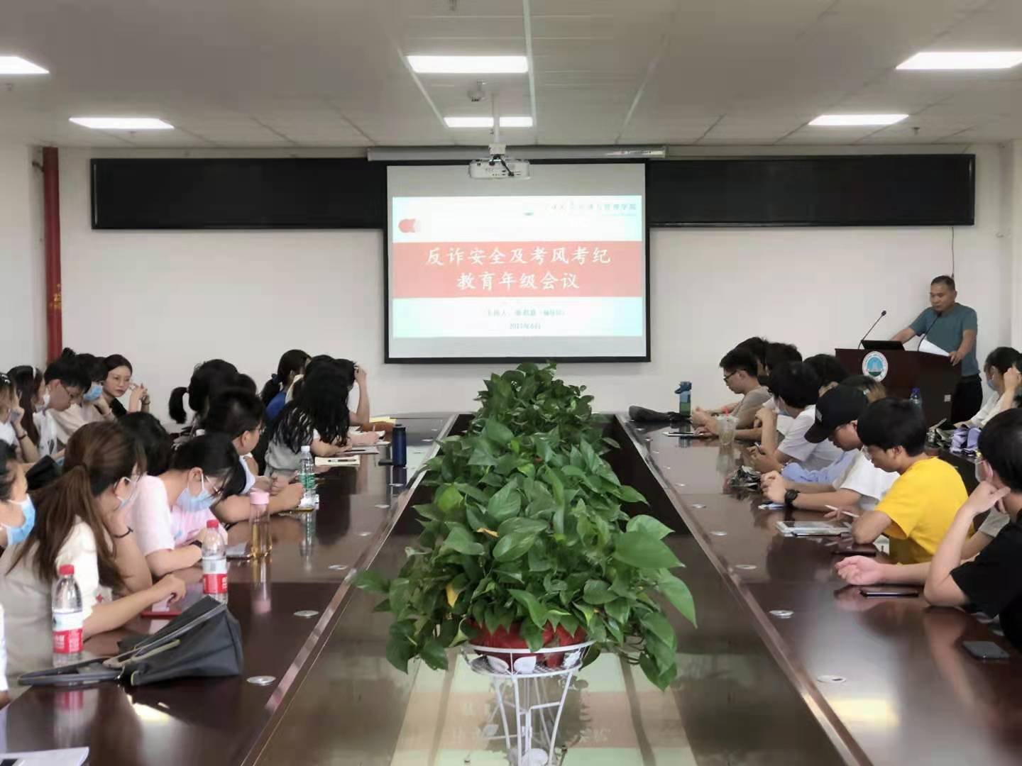 (通讯员 苏帅)太阳成tyc33455ccwww于2021年6月7日中午12.30在文科大楼召开了18级管理类考风考纪及反诈安全教育大会。本次会议由李博老师主持,年级辅导员娄君庭老师,各班班长及员工干部参加本次会议。