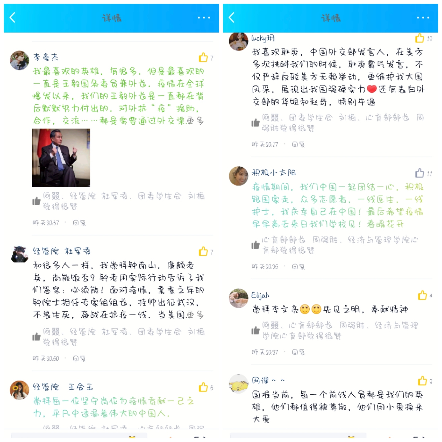 活动开展以来,全院员工积极参与。在短视频征集活动中,有的同学通过视频展现宅家期间学习的新技能;有的同学通过视频展现家庭温馨和睦氛围,如家庭影像合辑、趣味亲子活动等;有的同学通过视频展现有关抗“疫”的内容,包括患者或医务人员的抗“疫”经历、自身志愿服务经历等。在心愿墙线上互动活动中,团委员工会心育部为每日活动设置了不同的讨论话题。有分享在抗疫活动中自己最崇拜的英雄,有交流宅家期间如何调整情绪状态,有分享如何有效开展线上学习,员工们各抒己见,分享自己的感受、想法、愿望,体现了青春正能量。