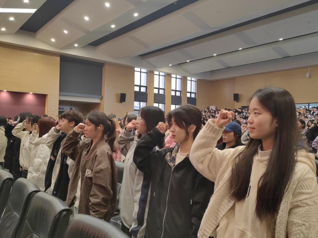 员工代表熊雪景带领全体22级本科生进行宣誓:“四级考试,势在必赢。”至此22级本科生表彰暨四级备考动员大会圆满结束。