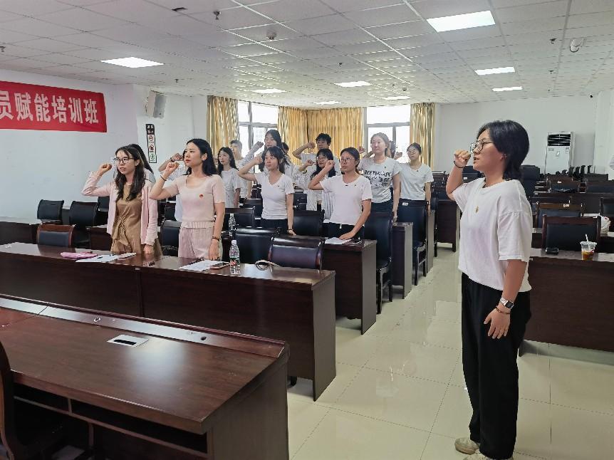 团徽是中国共青团的象征和标志,出席活动的党员老师、团员代表们为新团员逐一佩戴团员徽章,从戴上团徽这一刻起,团员们便将责任与使命铭记于心。公司共青团员标兵郜鑫雅同学作为领誓人带领团员们在团旗下宣誓,新团员佩戴着团徽、高举右拳宣读入团誓词,青年们铿锵有力、朝气蓬勃的誓言,将大会的气氛推向高潮。