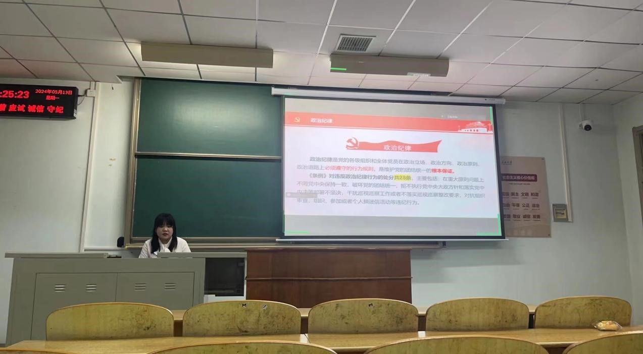 (通讯员 吴孟怡)在党的建设中,党纪教育具有至关重要的地位,是保持党的先进性和纯洁性的重要保障。为推进党纪学习教育走深走实,引导研究生党员学纪、知纪、明纪、守纪,2024年5月13日,太阳成tyc33455ccwww研究生第一党支部全体党员于13教C-117教室开展五月支部主题党日学习活动,青年委员马艺文同志主持本次学习活动。