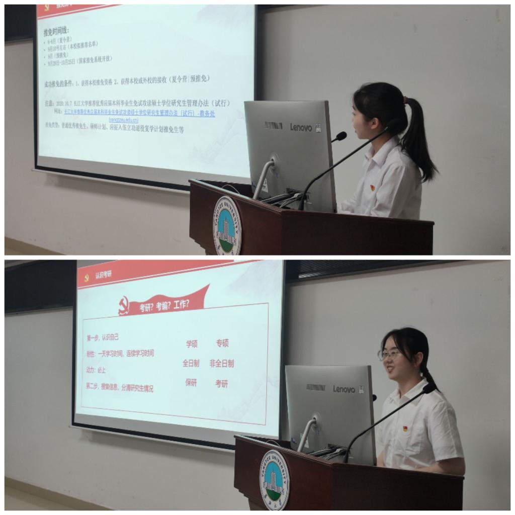 活动伊始,沈兰兰同志就推免时间线、成功推免的条件以及推免需要注意事项进行保研经验的分享。她着重强调要熟知保研流程,并建议全体党员选择保研要做好全面准备。武春霞同志分别从管理类联考的认识、备考时间表,备考资源推荐三个方面分享自己的考研经验,勉励党员同志们一直向前走,坚持不懈,终会成功。