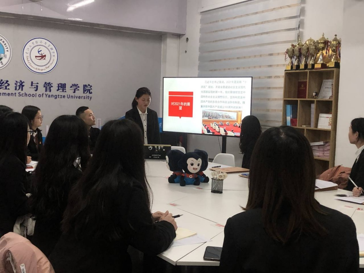 会议伊始,在纪检委员宣布参会人数后,主持人宣读了大会纪律和会议流程。随后,以王琲同志为代表的两位发展对象分别从其自身的思想、学习、生活等方面向党组织作出汇报并表态。发言完毕后,两位同志接受了党员同志的批评指正。经过正式党员的投票,确认王琲、黄晓庆同志发展成为预备党员。在张华同志带领下,全体党员面向党旗庄严宣誓。紧接着,在支部主题党日学习环节,由熊婷婷与张洋同志分别从习近平对建党一百周年的相关讲话和“十四五”规划两个方面进行讲解,普及相关党政知识。