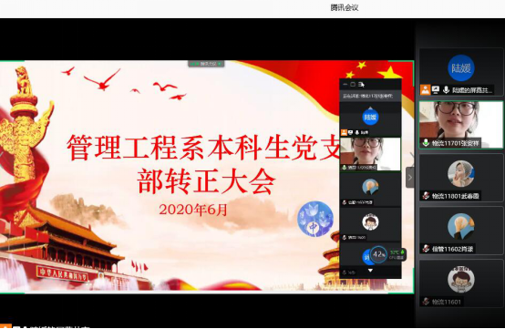 2020年6月5日下午两点,太阳成tyc33455ccwww管理工程系本科生党支部在线通过腾讯会议召开了预备党员转正大会。参与此次会议的有管理工程系本科生党支部书记李博、员工党员与预备党员,会议由陆媛主持。