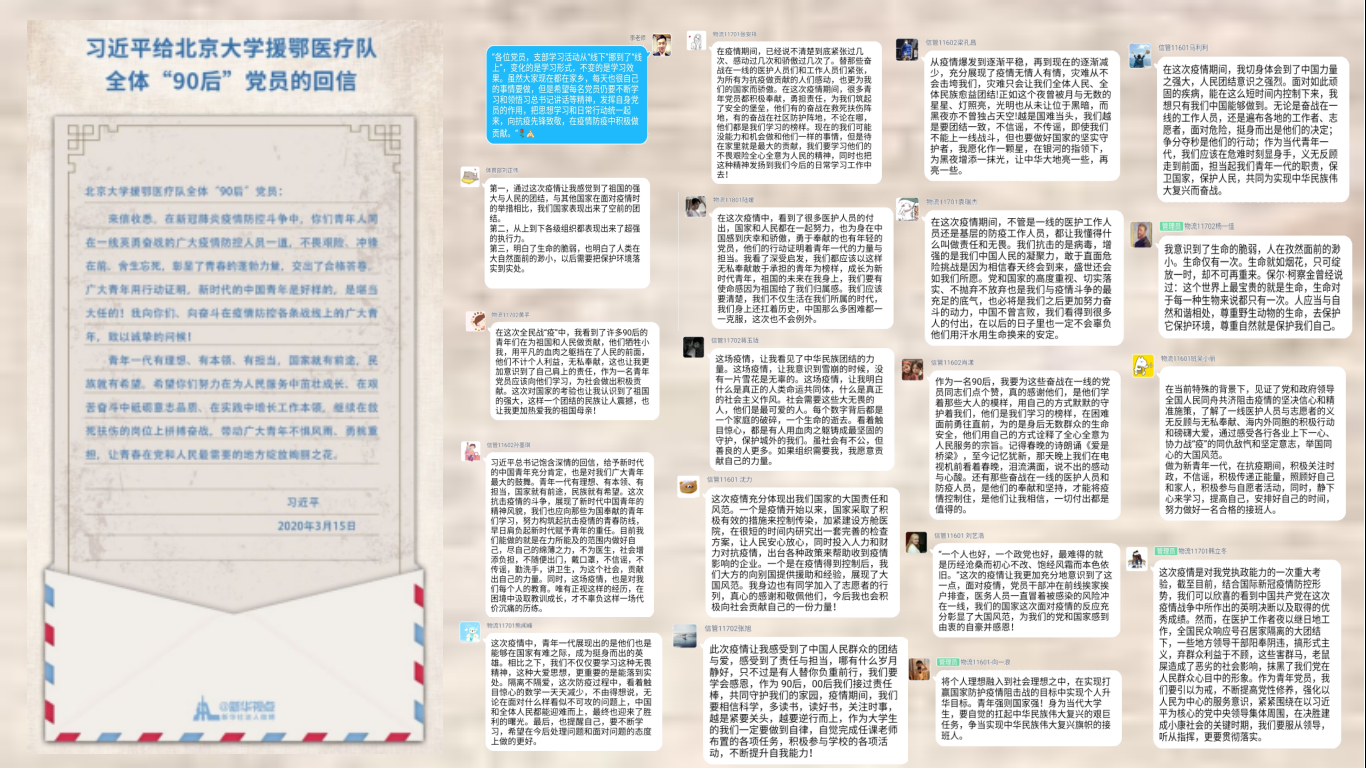 本次线上活动围主要绕习近平总书记给北京大学援鄂医疗队全体“90”党员回信内容进行集体讨论。全体员工党员对信中内容进行交流,并结合自身的经历和见闻发表看法。面对疫情,各位员工党员表示都能坚守自身党员的职责和义务,通过各种方式积极参与到防疫工作中。