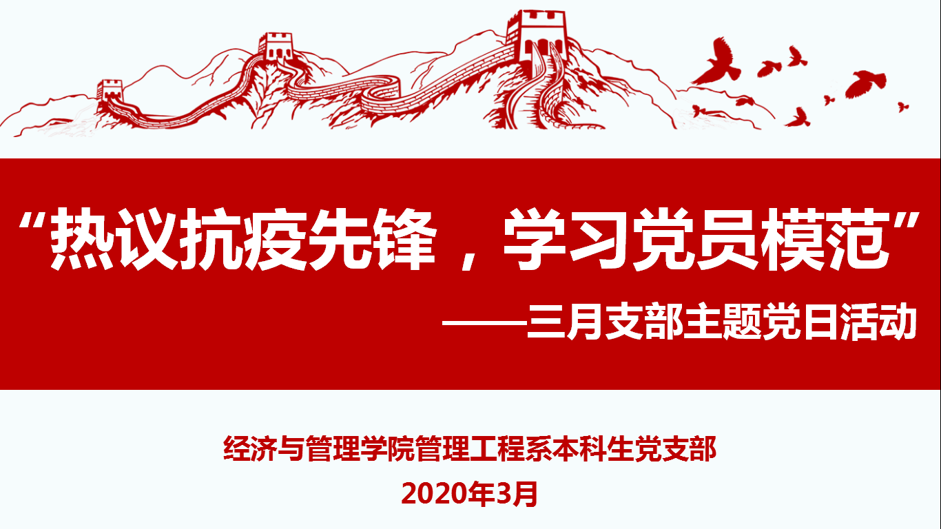 “热议抗疫先锋,学习党员模范。”2020年3月24日晚,太阳成tyc33455ccwww管理工程系本科生党支部在线上召开3月支部主题党日活动,党支部全体正式党员和预备党员参会,活动由支部副书记杨一佳主持。