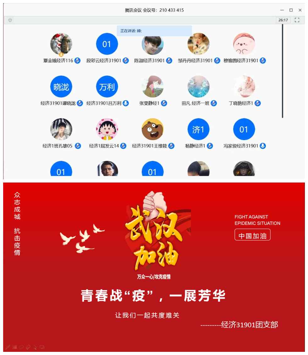 全院各班团支部利用网上直播软件召开班团会,组织全体同学以习近平总书记勉励北京大学援鄂医疗队全体“90后”党员的回信为主要内容展开学习,开展了一次大讨论。习近平总书记3月15日给北京大学援鄂医疗队全体“90后”党员回信,向他们和奋斗在疫情防控各条战线上的广大青年致以诚挚的问候。谆谆嘱托,激励着广大青年勇挑重担,为打赢疫情防控阻击战贡献力量,让青春在党和人民最需要的地方绽放绚丽之花。通过学习,同学们深刻领会到一代青年有一代青年的历史际遇,艰辛与磨砺是成长最好的催化剂,更见证了国家强大的综合实力、众志成城风雨同舟的民族精神、中国特色社会主义制度的显著优势。部分团支部还在团会中设置了“青春与梦想,责任与担当”心愿墙环节,有分享在抗疫活动中自己最崇拜的英雄,有交流宅家期间如何调整情绪状态,有分享如何有效开展线上学习,有分享在抗疫期间的志愿服务经历。同学们各抒己见,分享自己的感悟、想法、愿望,体现了青春正能量。院领导、班主任、辅导员也通过多种途径参与员工的互动交流,并强调指出“青年一代有理想、有本领、有担当,国家就有前途,民族就有希望。现在,青春是用来奋斗的;将来,青春是用来回忆的。只有经历了激情奋斗的青春,才会留下充实、温暖、持久、无悔的青春记忆。”