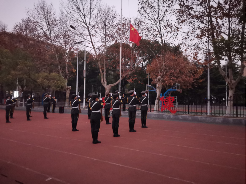 七点整,升旗仪式正式开始。伴随着庄严的《义勇军进行曲》响起,鲜艳的五星红旗冉冉升起,迎风飘扬,全体师生肃穆而立行注目礼,表达了对祖国的无限热爱及对国旗的敬畏。