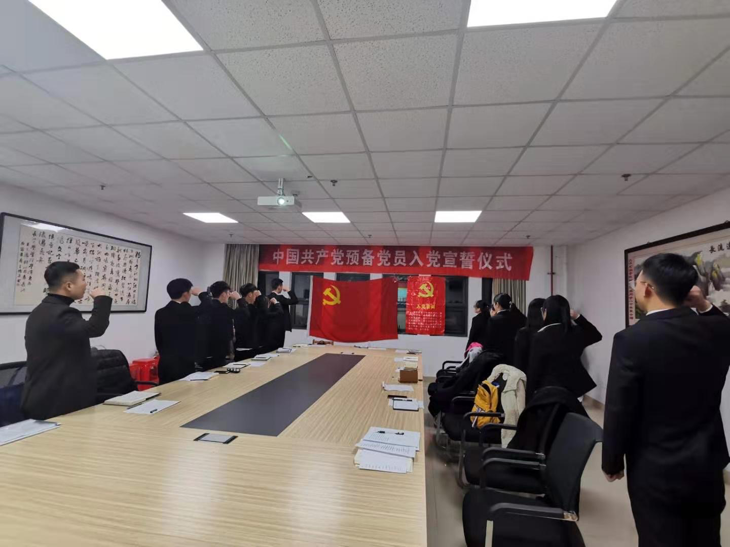 正式党员对四位同志的发言进行了提问,并告诉他们不要忘记自己的入党动机,成为正式党员之后更需做好表率。正式党员投票表决四位预备党员室能能够转正并现场唱票。最终,杨一佳等四名预备党员均全票通过。支部书记李博老师进行总结,并对四位转正党员提出要求,做好员工表率。在杨一佳同志的领誓下,全体党员同志面对党旗,进行宣誓。