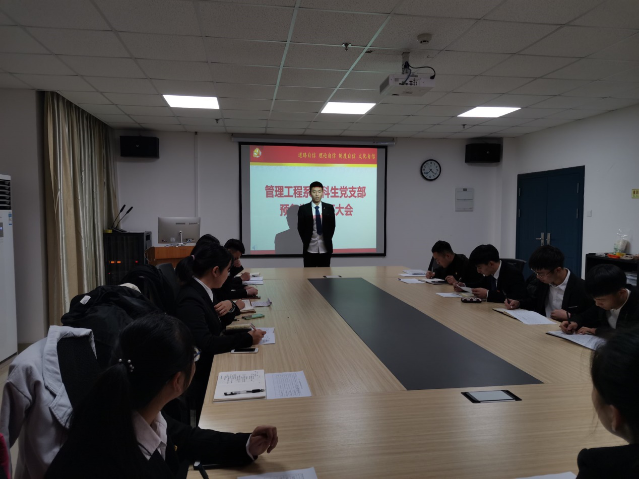 会议第一项由各位预备党员上台进行简短的发言,介绍自己在预备期内的各个方面的情况。杨一佳同志发言道:“在预备期间,自己努力在班级里起到模范带头作用,在思想上不断加强思想道德素质,加强思想建设,在学习上除了学好专业课,也在积极学习和探索其他方面的知识,在工作上不断加强自己的工作能力,协助公司里的各项工作,在生活上积极帮助身边的同学。”肖漾也谈到,虽然已经大四,但时常自问入党动机是否改变,初心是否还在。作为一名普通的员工干部,他非常明确服务同学的意义,不断践行为人民服务的宗旨。