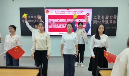随后,团会开展了共青团员不能信仰宗教专题教育。在知识问答环节,同学们积极参与,争先抢答,现场学习氛围热烈活跃。在代表同学的带领下,全体团员重温入团誓词,以誓言坚定理想目标。
