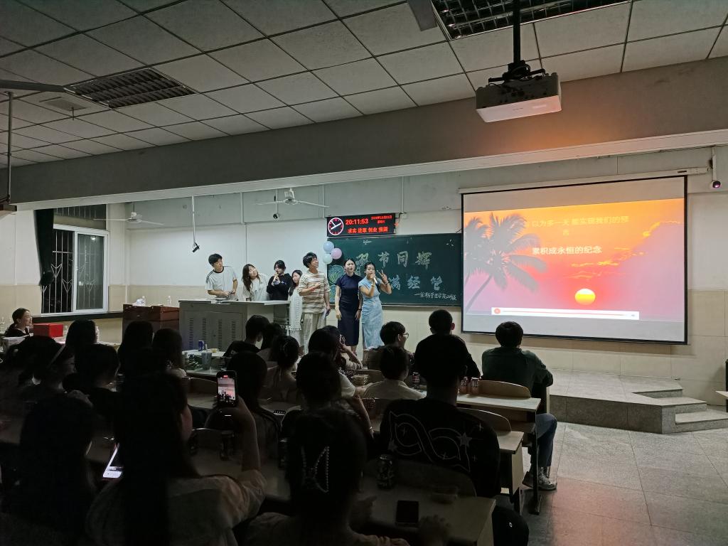 除了精彩的文艺表演,晚会还特别设计了多个互动小游戏环节,如结合专业特色的“指尖‘钞’能力”点钞比赛、考验观察与表达能力的“伪装者挑战”、紧张有趣的“寻‘爆’大挑战”以及“声初辨金曲”猜歌环节等。游戏不仅拉近了同学之间的距离,更将现场气氛一次次推向高潮。参与游戏和才艺展示的同学均有机会参与抽奖,赢取便利贴、笔记本、日用礼品等丰富奖品。当晚,晚会特别设置了一个温馨环节——为两位恰逢生日的2023级同学举行了简朴而真挚的集体生日庆祝仪式。在全场师生齐唱《生日快乐》的歌声中,两位“寿星”惊喜上台,接受来自公司和同学们的诚挚祝福。这份突如其来的温暖,不仅让过生日的同学感动不已,也让所有在场师生感受到经管公司大家庭的关怀与情谊,将晚会推向情感的高潮。