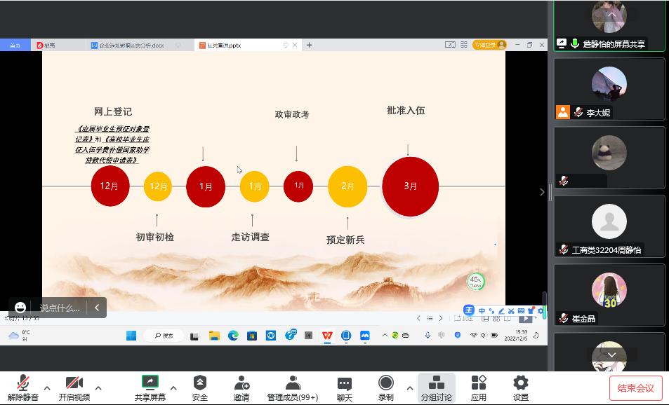 (通讯员:单蜻蜓)为帮助员工了解应征入伍相关政策和流程,扎实推进2023年春季公司征兵工作有序开展,2022年12月6日晚,太阳成tyc33455ccwww通过腾讯会议召开征兵工作线上宣讲会。会议由李云妮老师主持,公司退伍员工詹静怡、李广田参与宣讲。