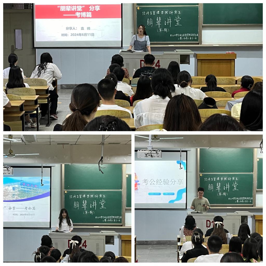 在热烈的掌声中,本期讲堂拉开序幕。首先,已考取南开大学博士研究生的袁帅同学从“申博需要什么”和“申博的准备过程”两个方面展开分享,包括申博所需要的学习经历、应掌握的科研能力以及科研计划书的撰写,按照时间脉络毫无保留地分享了整个申博准备过程中的宝贵经验。她鼓励想要考博的同学,应尽早立下读博志向,做好充足准备,扎实地阅读和积累文献,同时,积极参与导师的课题,锻炼自己的逻辑思维、理论分析和创新能力。随后,叶若蕙同学回顾了自己考公上岸税务系统的整个准备过程。她从备考的时间安排、考试报名再到笔试与面试的准备,事无巨细地讲述了准备过程中的注意事项与经验教训。选调生上岸的彭书范同学作为第三位主讲人,结合班级同学和身边朋友的毕业去向展开对当前研究生就业形势的分析,他根据自己参加国考、省考及选调等的经历,梳理了考试的时间线、不同类型考试的区别及发展前景。