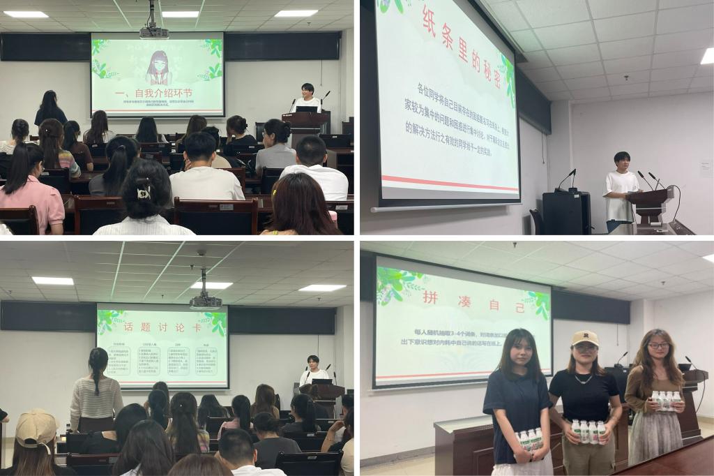 首先,参加活动的同学依次进行简单的自我介绍,带动气氛。经过此环节,现场氛围变得融洽,同学们紧绷的心逐渐放松下来。接着,进行第二项活动—纸条里的秘密。同学们将自己生活中遇到的困惑写在纸条中,从中抽取几个具有共识性的问题进行现场讨论与解答,这个环节让同学们感受到了不同思想碰撞的魅力,也拓宽了他们解决心理问题的视野和思路。第三项和第四项活动分别是心理话题讨论与分享停止内耗的方法。同学们积极分享自己的理解,相互倾诉与倾听,现场讨论热烈。最后一个活动为拼凑自己,同学们通过几个词语拼凑出一句话,表达各自对未来的期许。