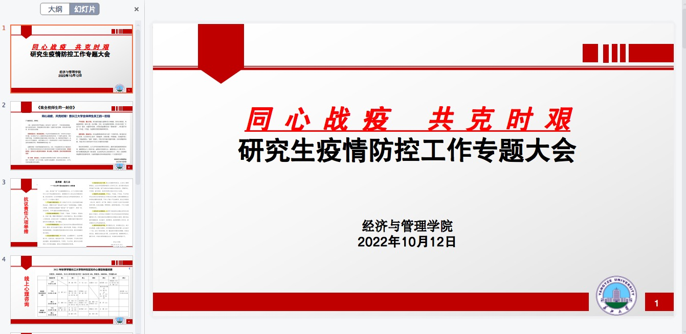 (通讯员:彭书范)2022年10月12日晚,同心抗疫,共克时艰,经管公司召开了研究生疫情防控工作专题大会,研究生辅导员朱翠玲和黄承石老师主持和参会,公司全体研究生参加会议。