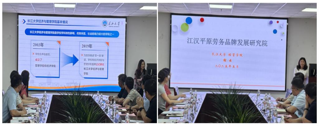 谢云介绍了江汉平原劳务品牌发展研究院共建情况,从共建背景(为什么)——合作进展(做什么)——合作方式(怎么做)——合作成果(调研报告)——合作目标(未来展望)等五个方面进行了详细介绍。谭昶和武慧慧介绍了运行模式、建设经费和合作机制。