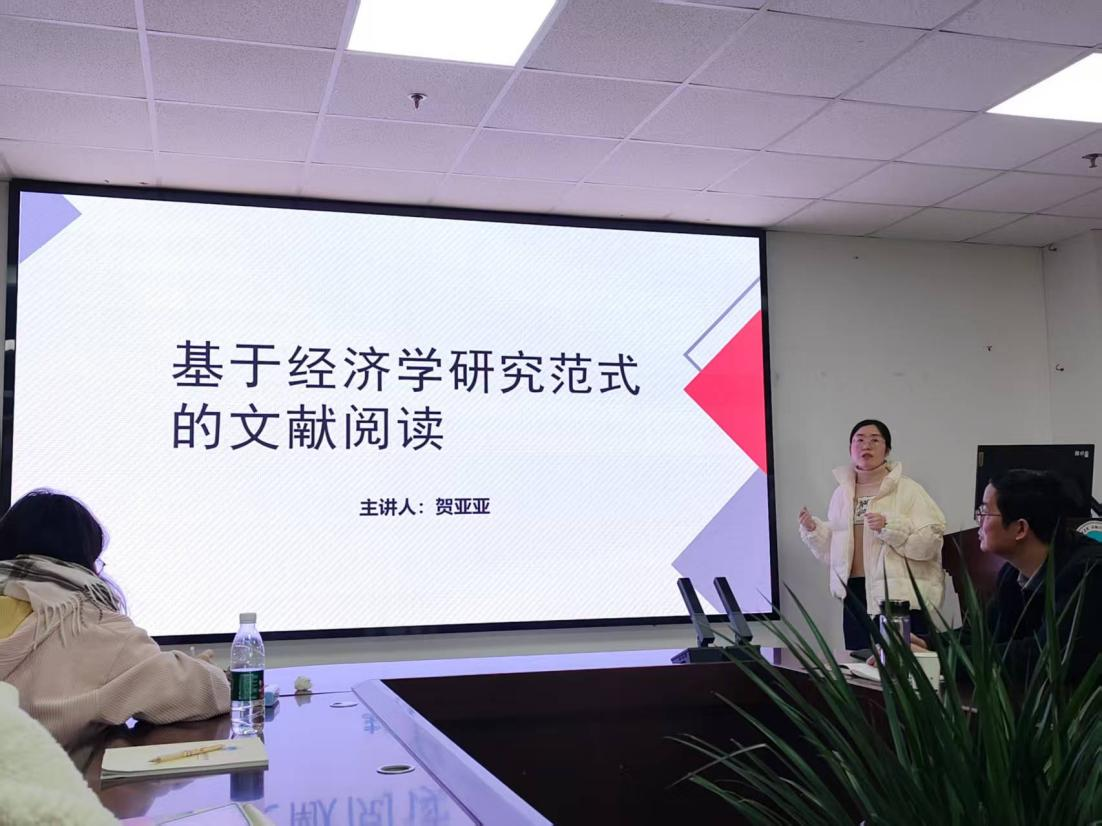 贺亚亚老师以“基于经济学研究范式的文献研读”为主题,从经济学范式的“主体-约束-行为”角度出发,阐释了当前应用研究的三大类型,并以具体论文为例,指导师生在文献研读中要以明确文章要回答的科学问题、文章所属类型及是否对问题做出解答这三个问题为导向,在阅读过程中寻找创新点。