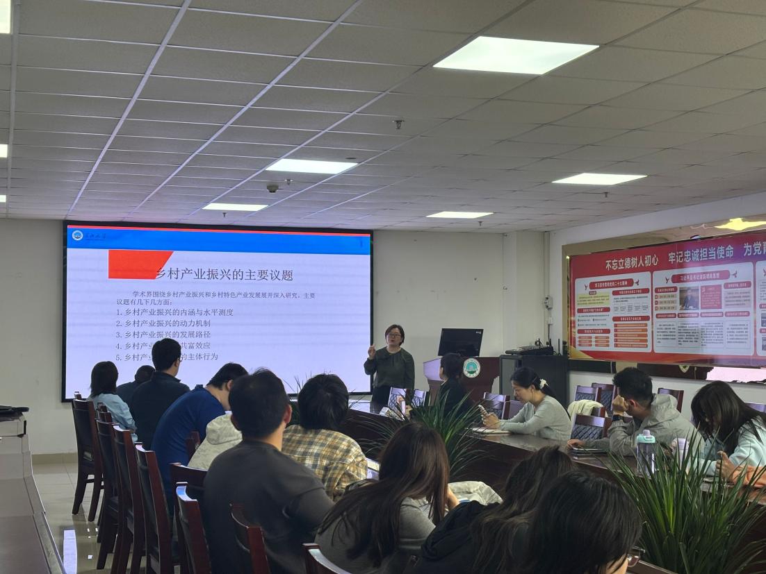 首场报告中,熊芳副教授以“乡村产业振兴的主要议题与选题思考”为题,系统解读政策背景,提炼出乡村产业振兴的五大核心议题:内涵测度、动力机制、发展路径、共富效应及主体行为。她结合实证研究方法,提出“数字技术赋能产业升级”“新型经营主体培育”等四个前沿选题方向,并强调“选题需立足国家战略需求,扎根田野调查”,为青年学者指明科研方向。